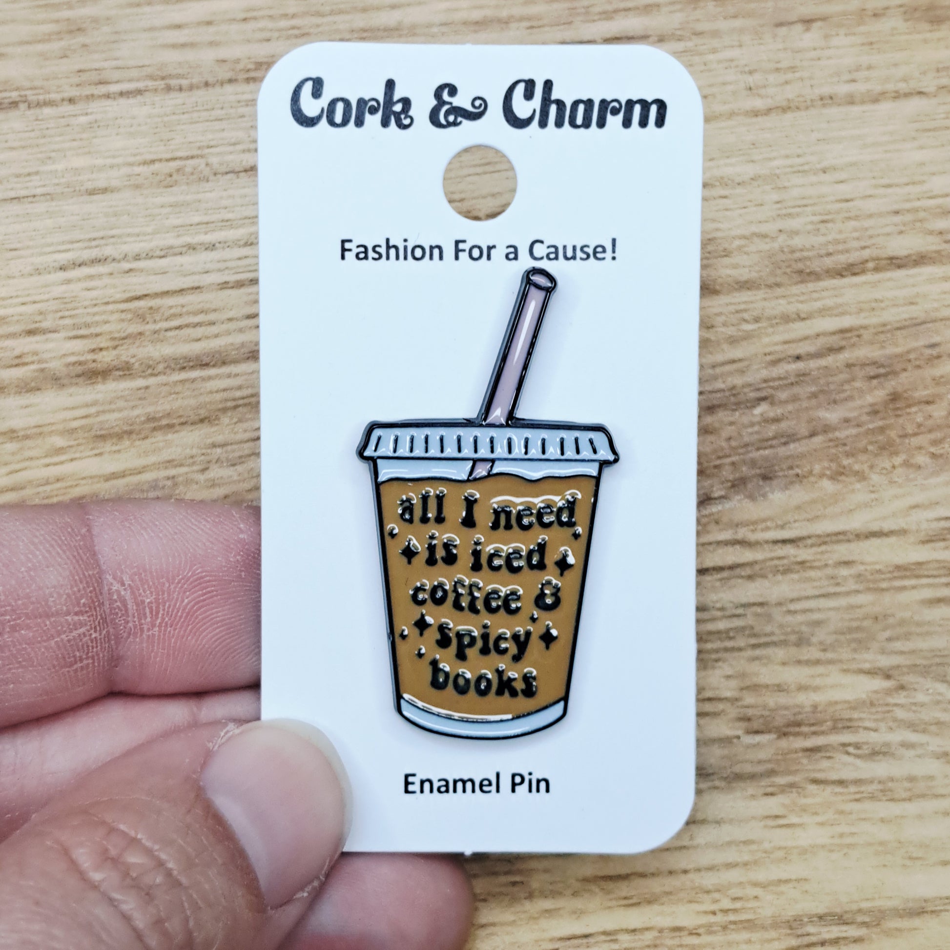 All I Need is Iced Coffee and Spicy Books Book Enamel Pin