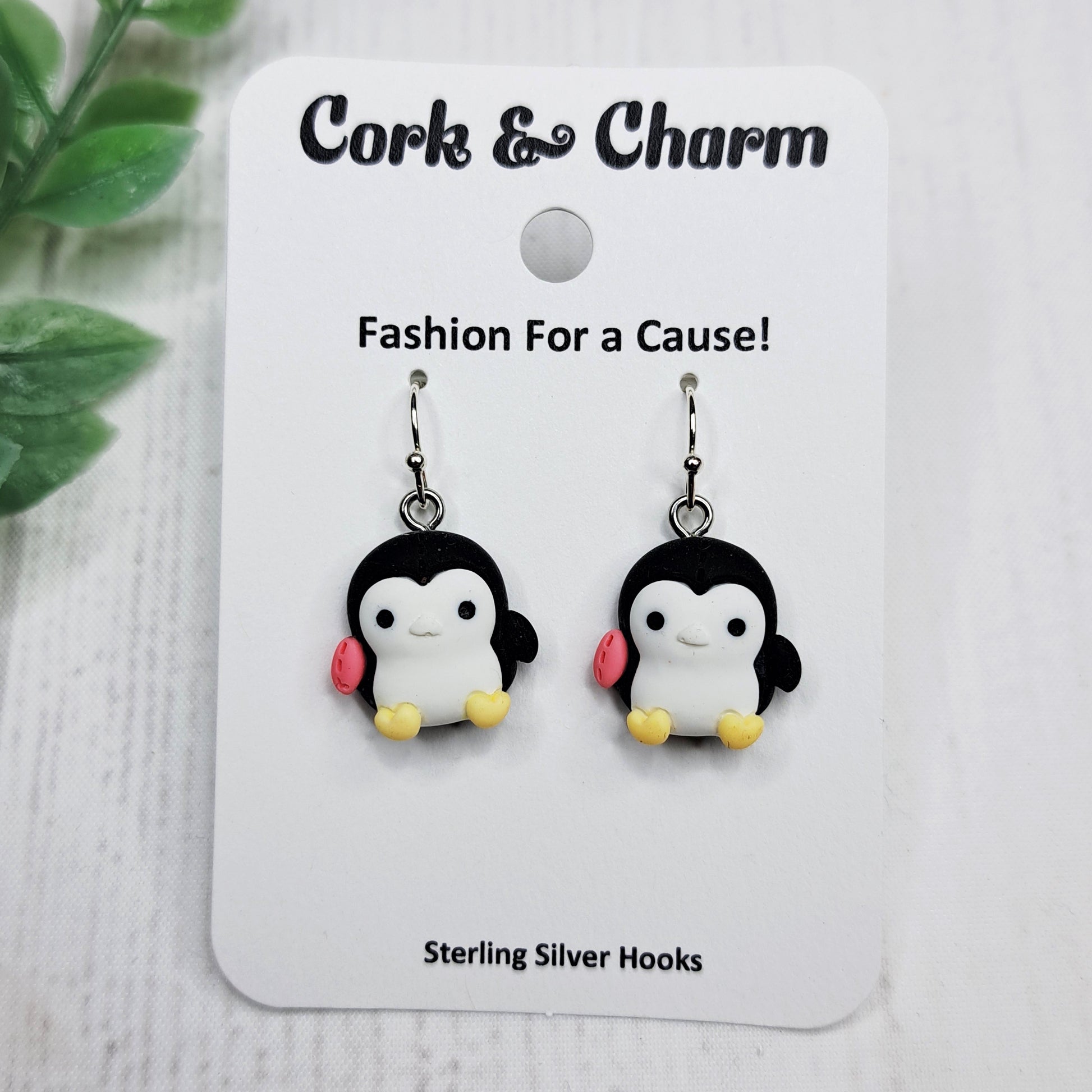 Black Stitched Penguin Bird Resin Sterling Silver Earrings