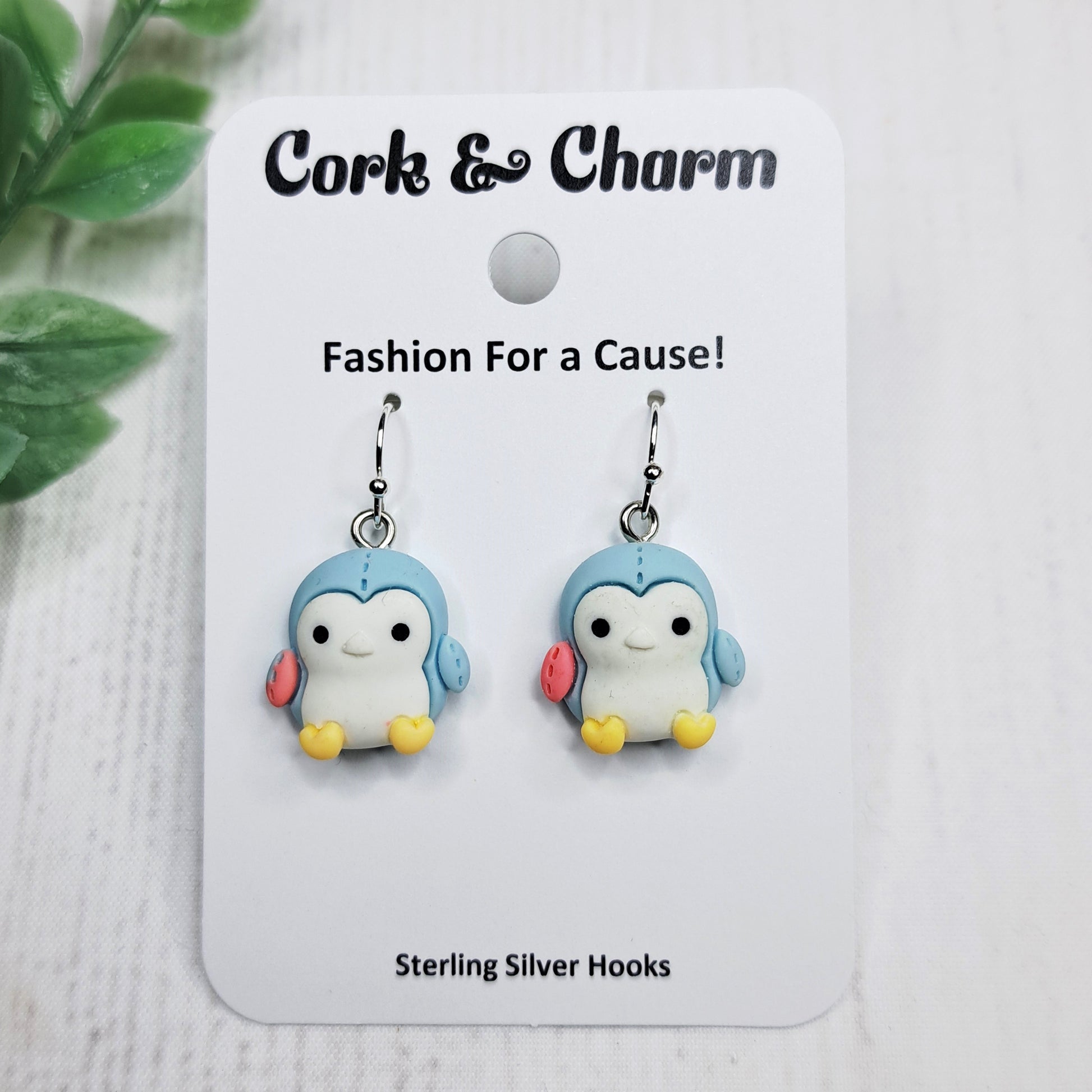 Blue Stitched Penguin Bird Resin Sterling Silver Earrings