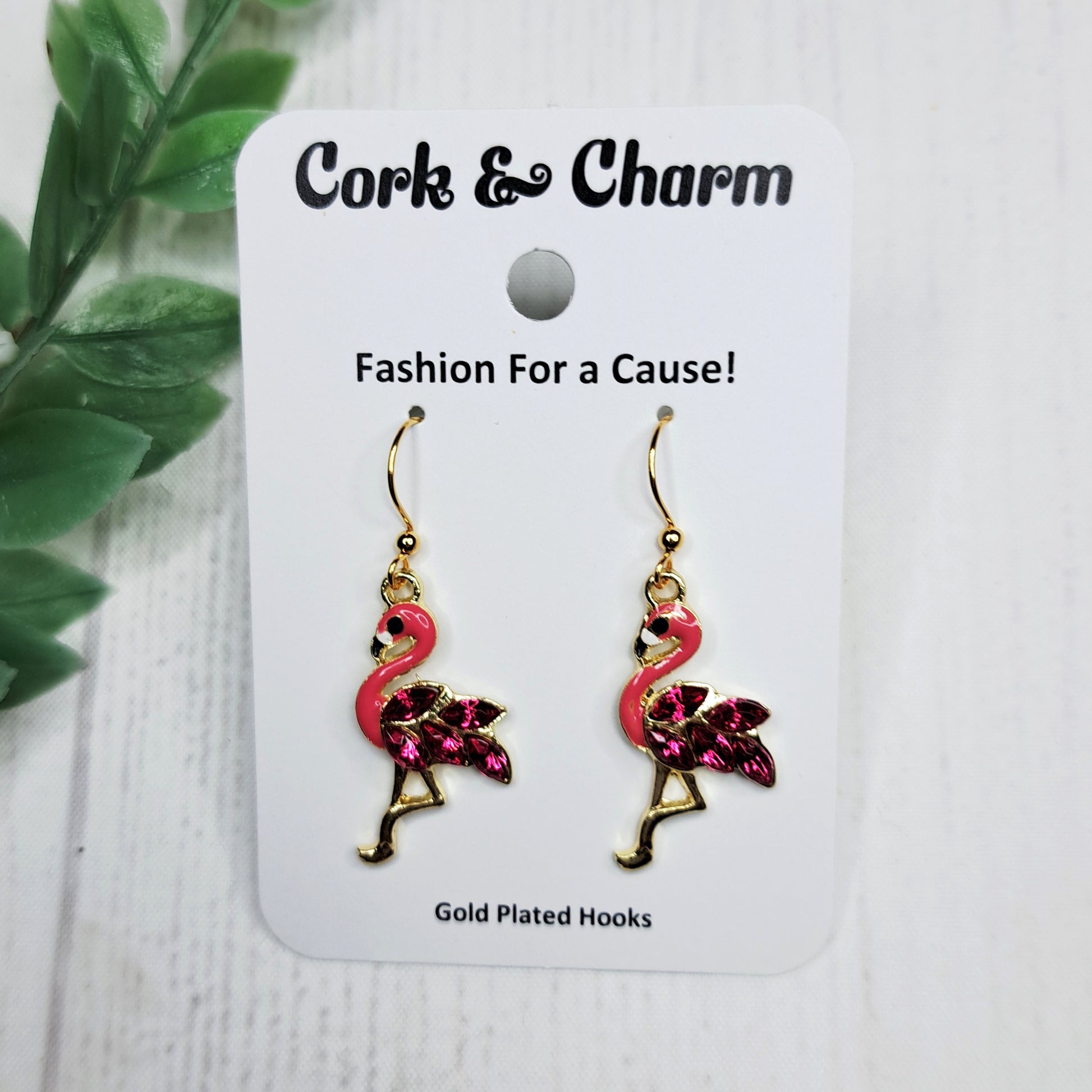 Bright Pink Flamingo Bird Rhinestone Gold Earrings