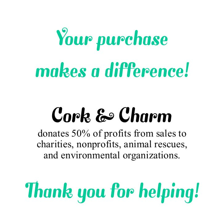 Cork and Charm donates 50% of profits to charities, nonprofits, animal rescues, and environmental organizations.