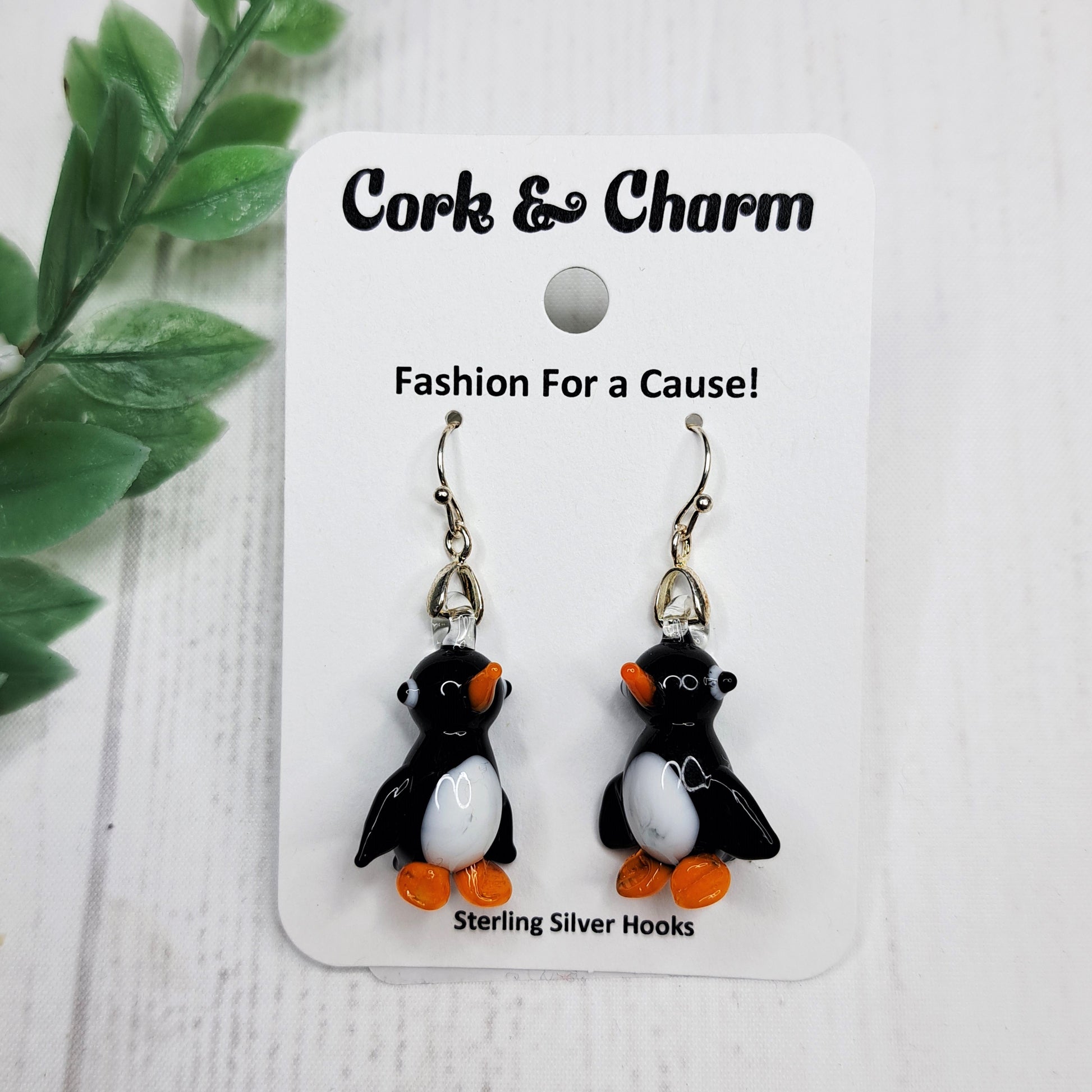 Glassblown Black White Penguin Bird Sterling Silver Earrings